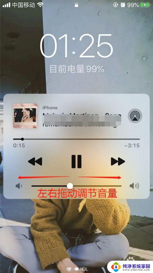 4.第三种方法,我们在听歌时。手机的锁屏界面会显示歌曲,上面有可以调节音量的操作,只需要左右拖动,即可调节音量。