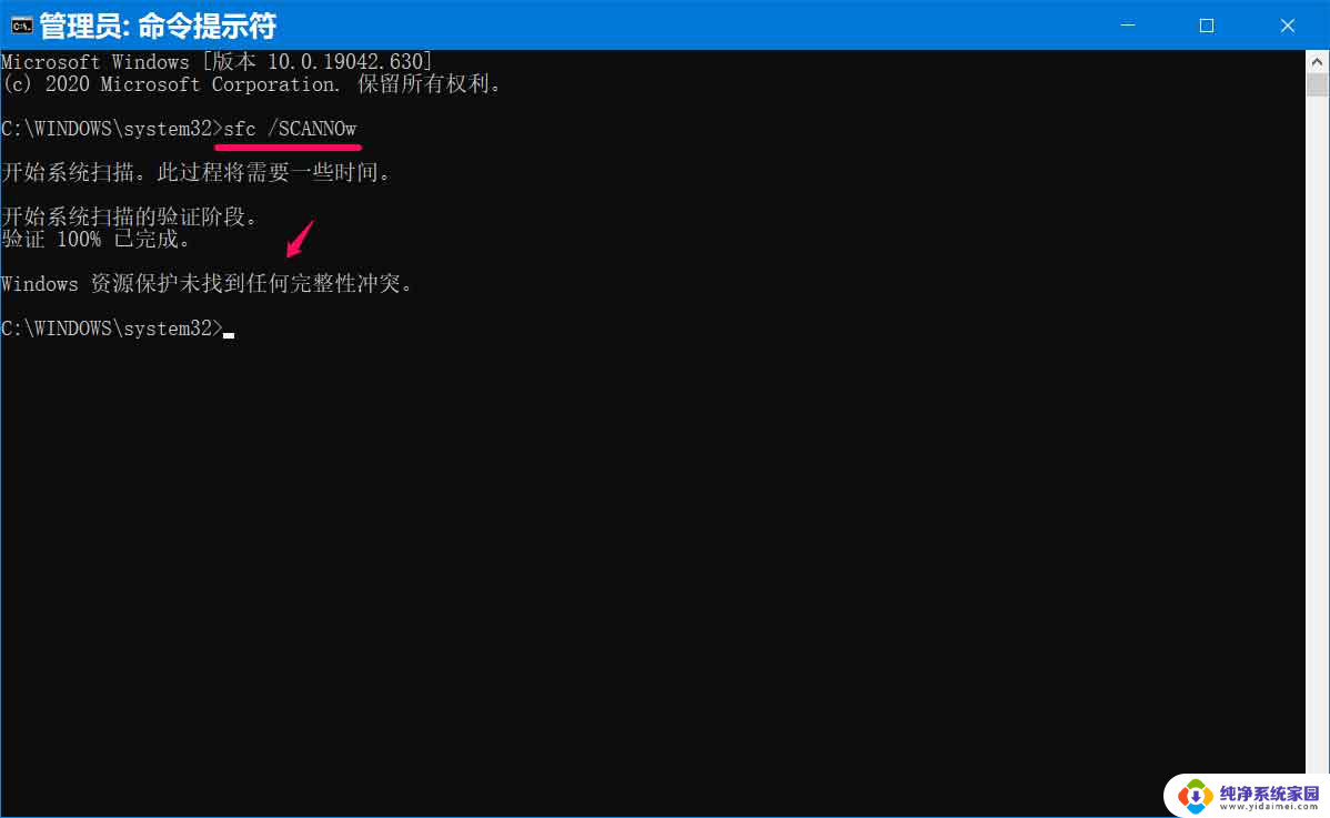 在命令提示符(管理员)窗口中输入 sfc /SCANNOW 命令,按下键盘上的回车键。待其运行完成,显示 资源保护未找到任何完整性冲突 即可。