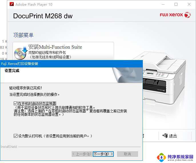 7、设置安装完成,可以勾选“在开机时启动状态监视器”和“设为默认打印机”。点击下一步。