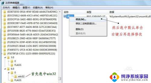9.左边选择win32,然后选中右边的默认后右键单击再选择修改。